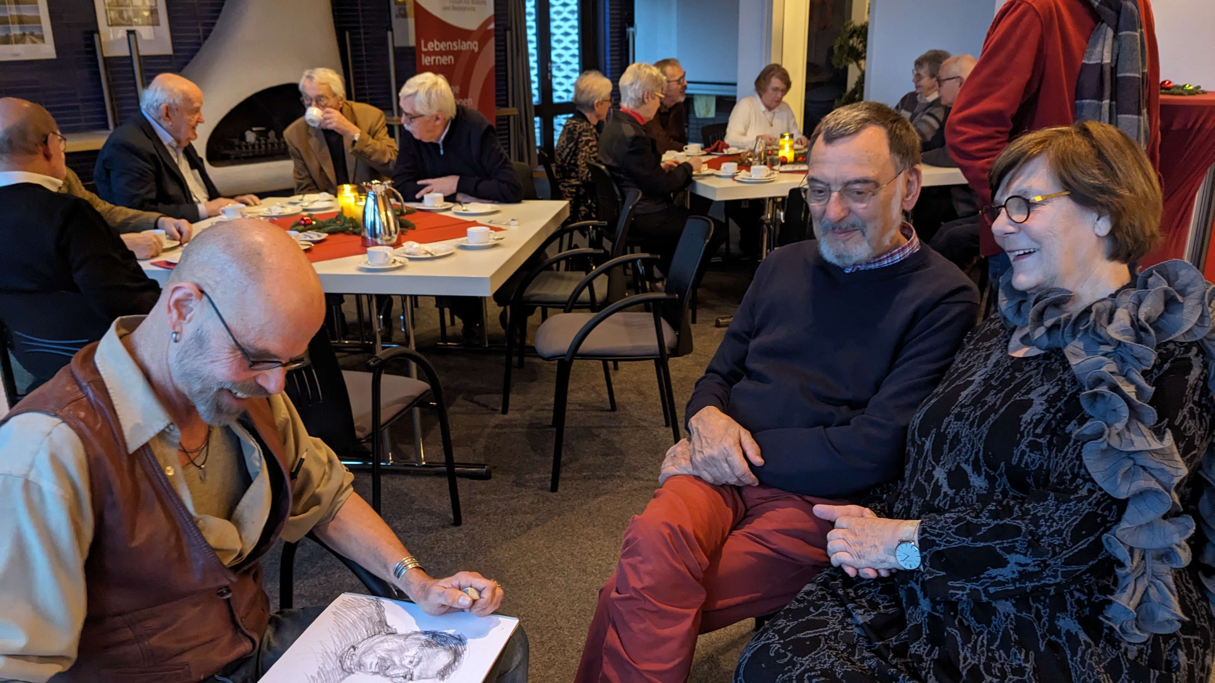 Das Programm dieses Nachmittags wurde von dem Dortmunder Autor Thomas Kade gestaltet, der uns mit heiteren und besinnlichen Texten unterhielt, die oft auch einen autobiografischen Hintergrund hatten oder von Dortmunder Orten handelten, z.B. dem Comicladen in der Kaiserstraße, Kades Fußballkneipe in der Von-der-Tann-Straße oder dem Hauptfriedhof. Der Maler und Grafiker Mathes Schweinberger, der als weiterer Künstler engagiert war, fertigte in kurzen Sitzungen von ca. 15 Minuten Porträts von Teilnehmenden an, die diese dann unentgeltlich mit nach Hause nehmen konnten.