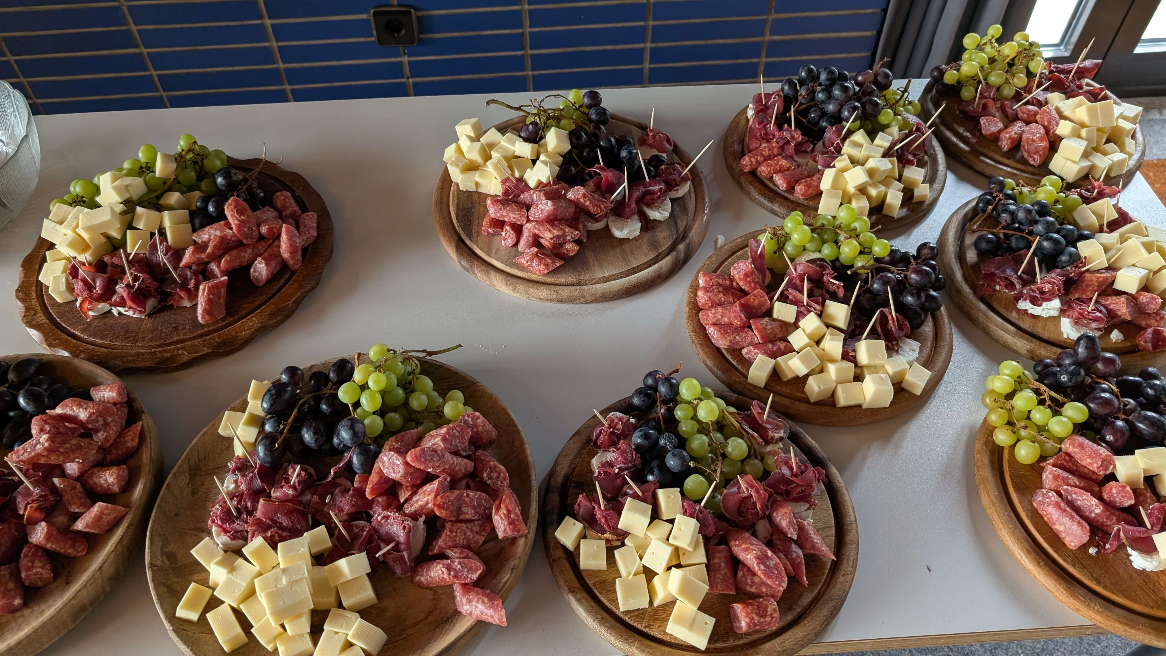 • Käsewürfel, Weintrauben und frisches Brot
